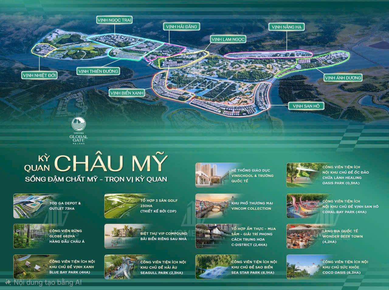 Châu Mỹ tái hiện kỳ quan Vịnh biển biểu tượng của nước Mỹ, kết hợp hài hòa giữa không gian xanh sinh thái, Vịnh biển tự nhiên và hệ tiện ích đẳng cấp, kiến tạo phong cách sống năng động – hiện đại – thời thượng, biểu trưng cho “Giấc mơ Mỹ”. Ngôn ngữ kiến trúc: Mỹ hiện đại – Nhiệt đới hiện đại.